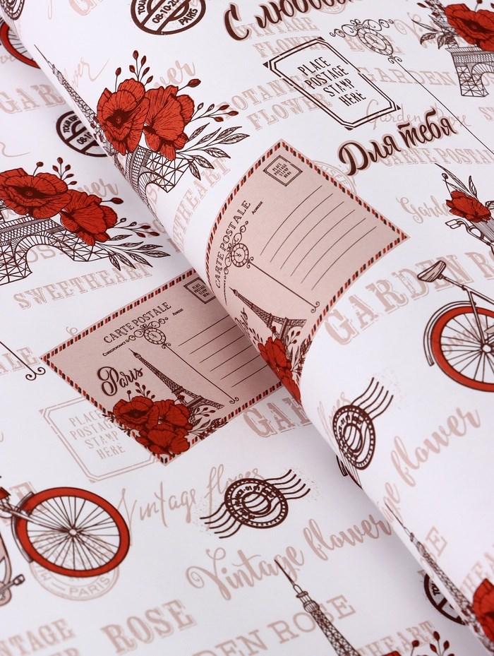 Бумага упаковочная крафт белый "Париж, с Любовью!", красный, 0.72*10м, 60гр