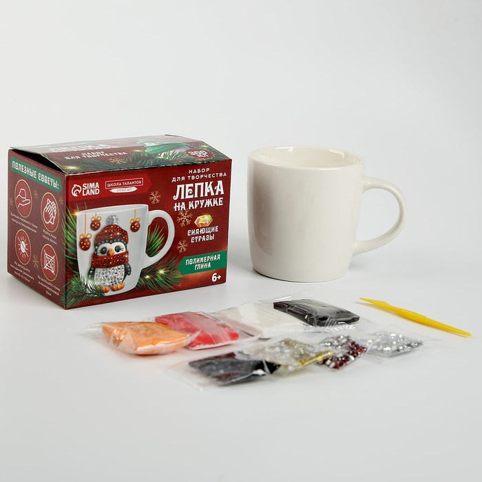Декор кружки полимерной глиной со стразами «Новый год! Пингвин в шапочке», н-р д/творчества