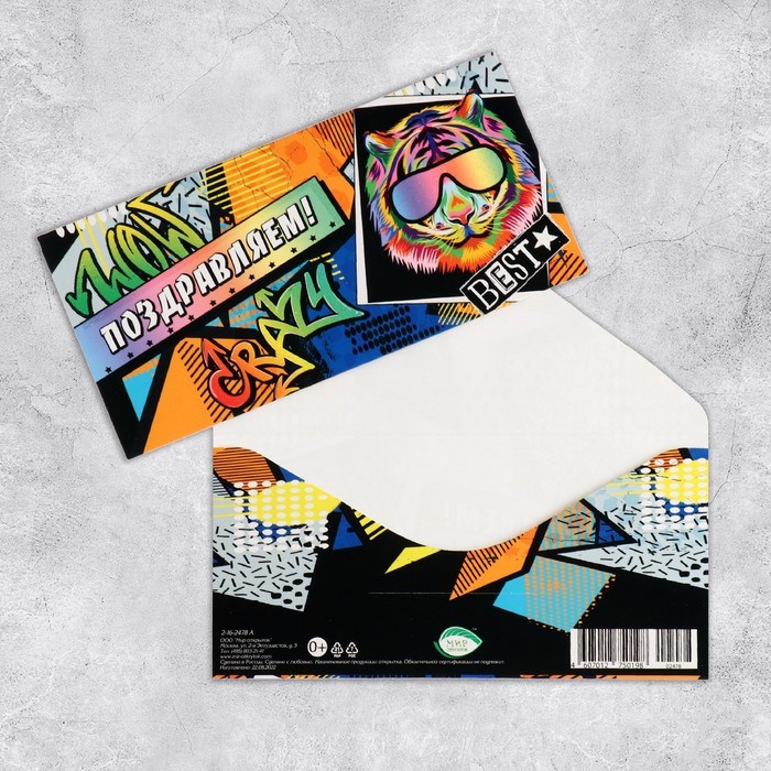 Конверт д/денег "Поздравляем!" глиттер, тигр, 17х8,3см