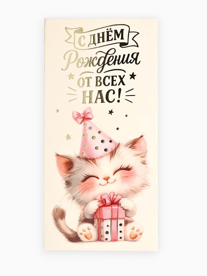 Конверт д/денег «С днём рождения», котик, тиснение, 16.5*8см