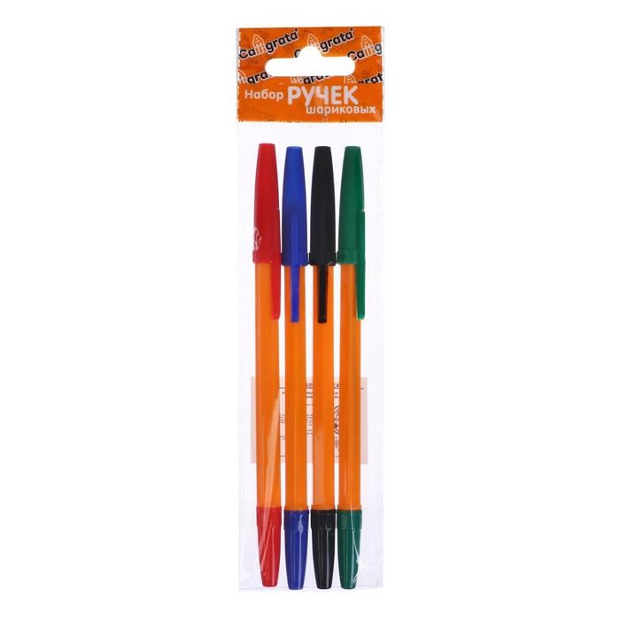 Н-р ручек шариковых 4цв, стержень 0,7мм, синий, красный, черный, зеленый, корпус оранжевый