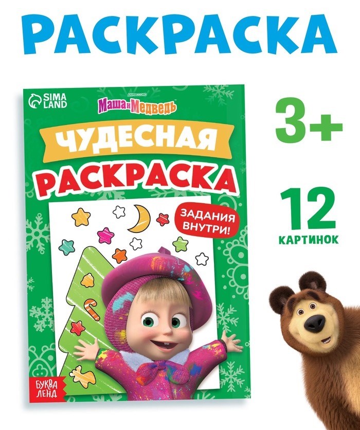 Раскраска новогодняя с заданиями «Чудесная», А5, 16стр, Маша и Медведь