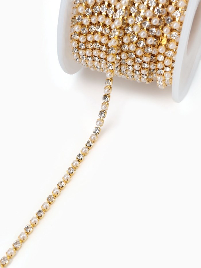 Цепь со стразами и жемчугом, металл, пластик, стекло, 2.5мм, 1м, цв золотой