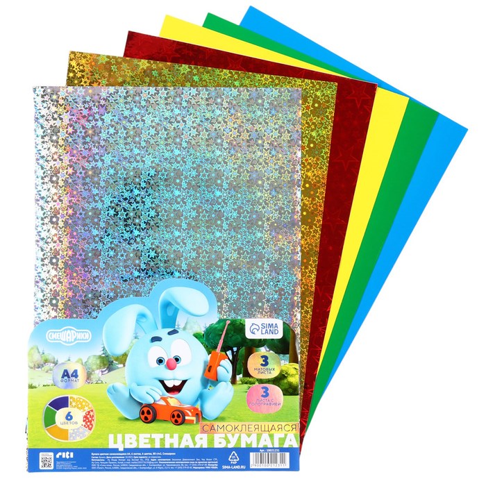 Цветная бумага самоклеящаяся А4, 6л, 6цв, 80г/м², «Смешарики»